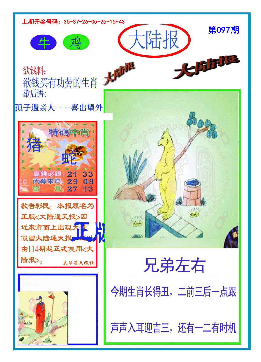 | 035期 | 兔鸡猪蛇猴 | 開:猪44准 |